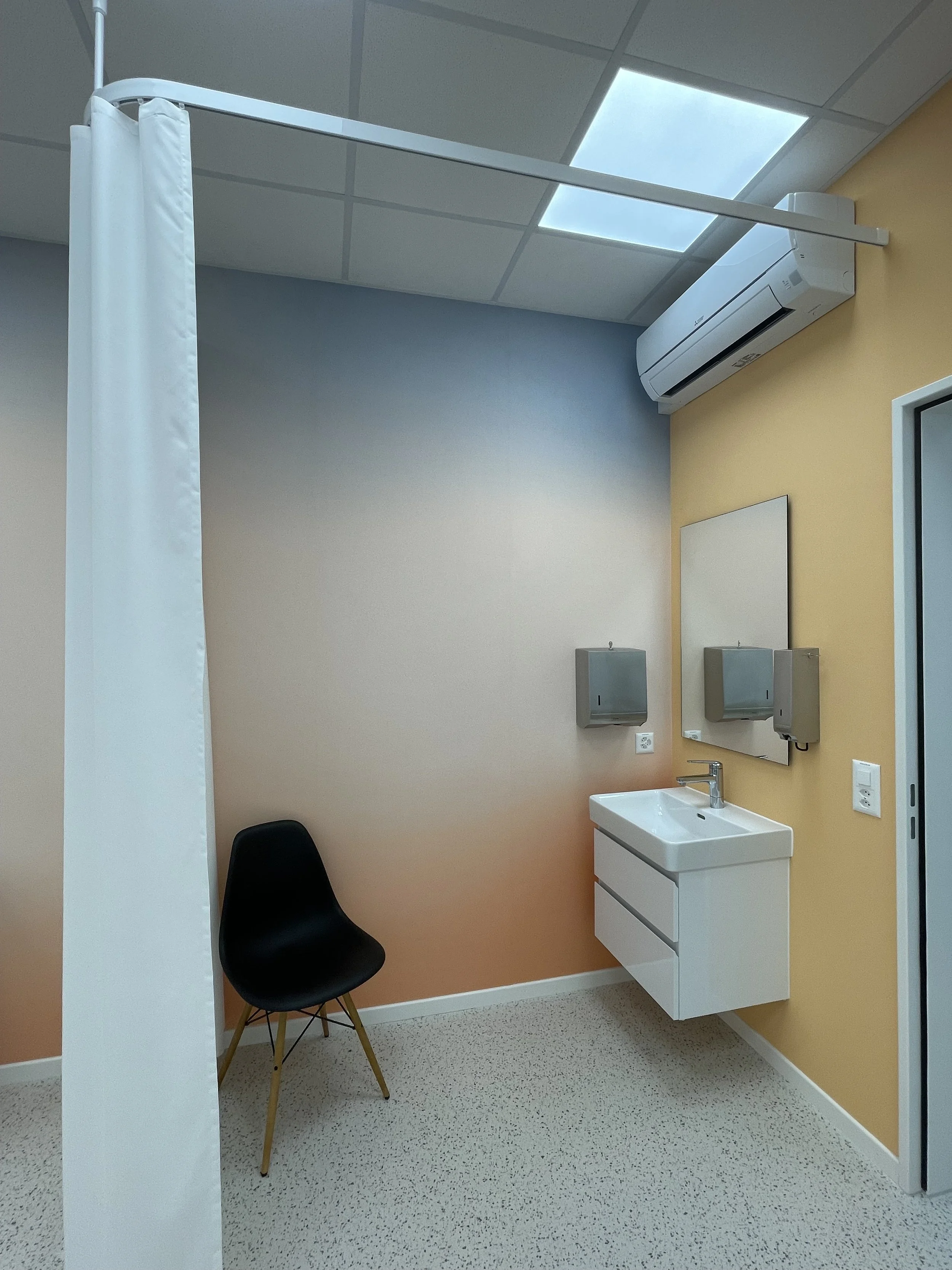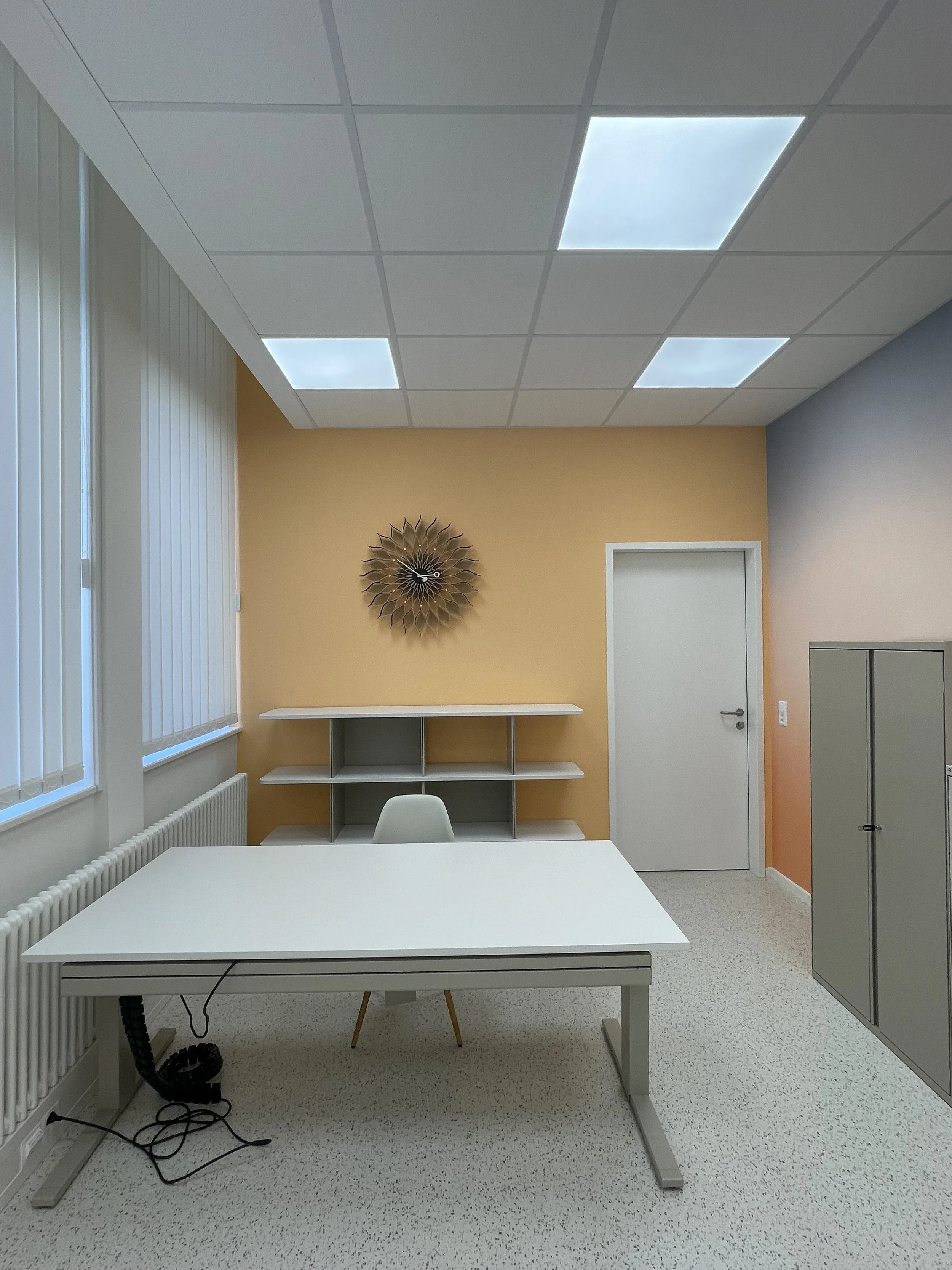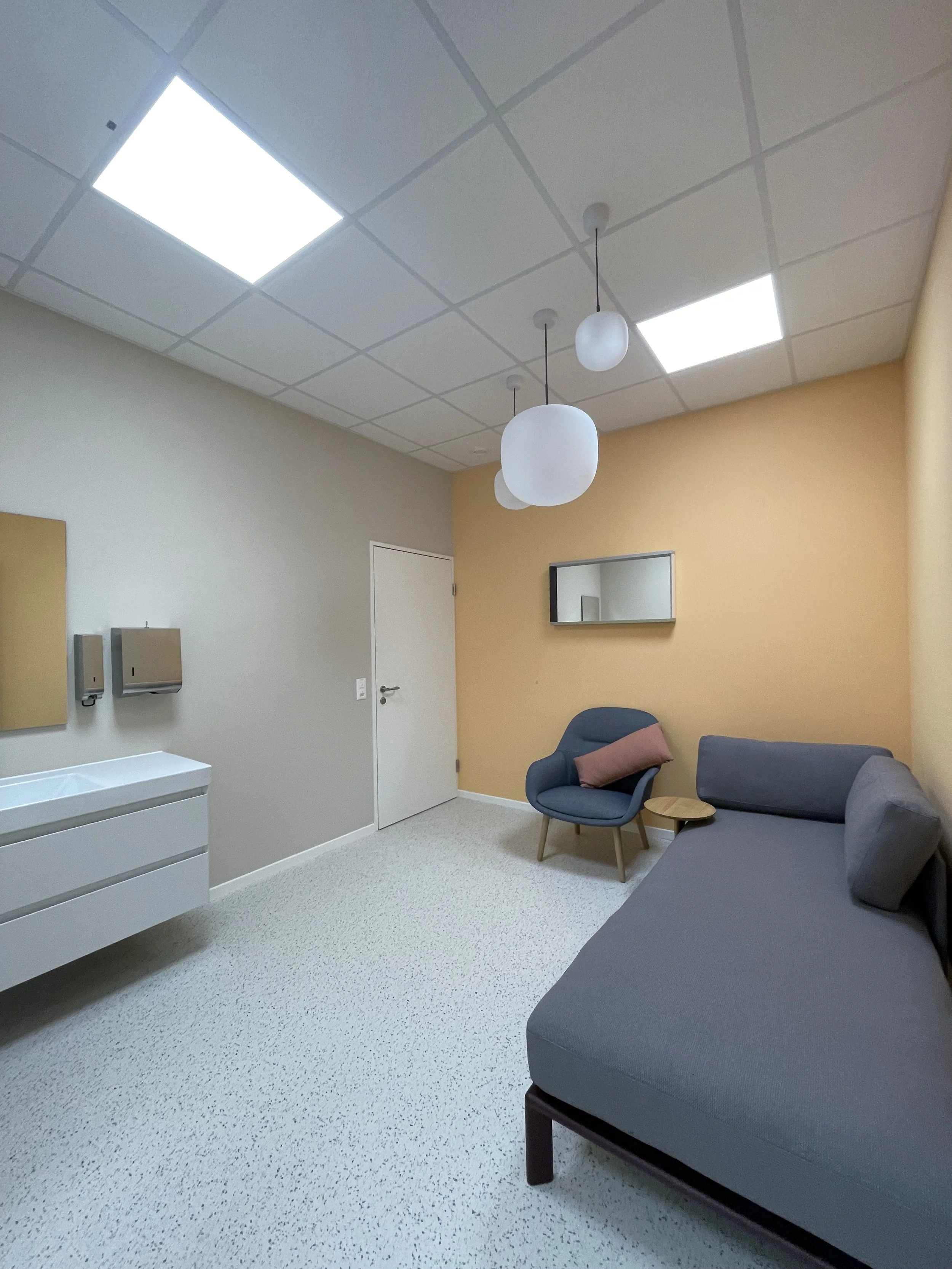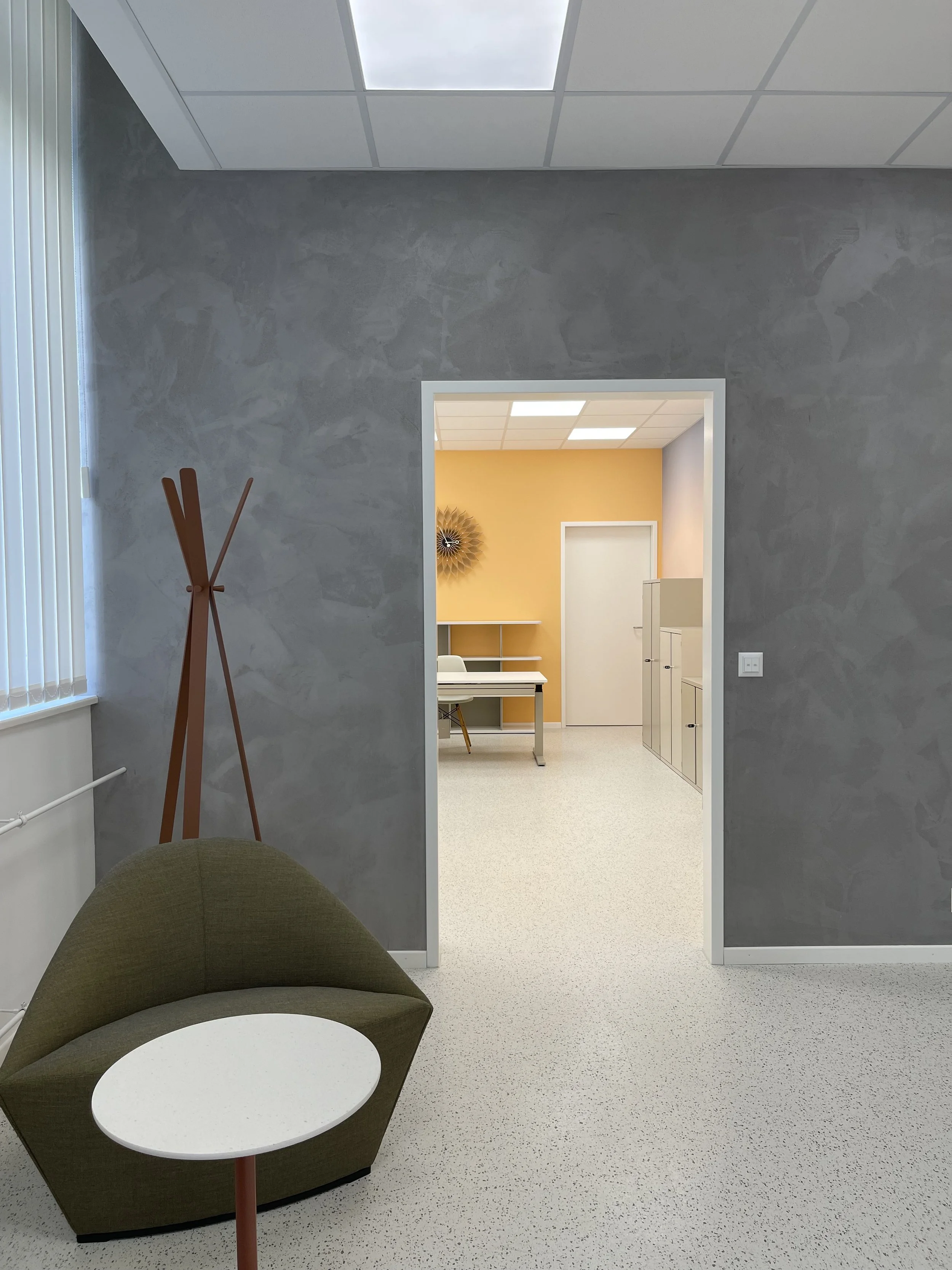 Am Anfang wirkte die Fläche eher trist, und das Ärztezentrum war in provisorischen Containern untergebracht. Heute präsentiert sich die neue Betriebspraxis für die Mitarbeitenden in mutigen Farben, mit hochwertigen Möbeln und einem Kautschukboden im Terrazzomuster.