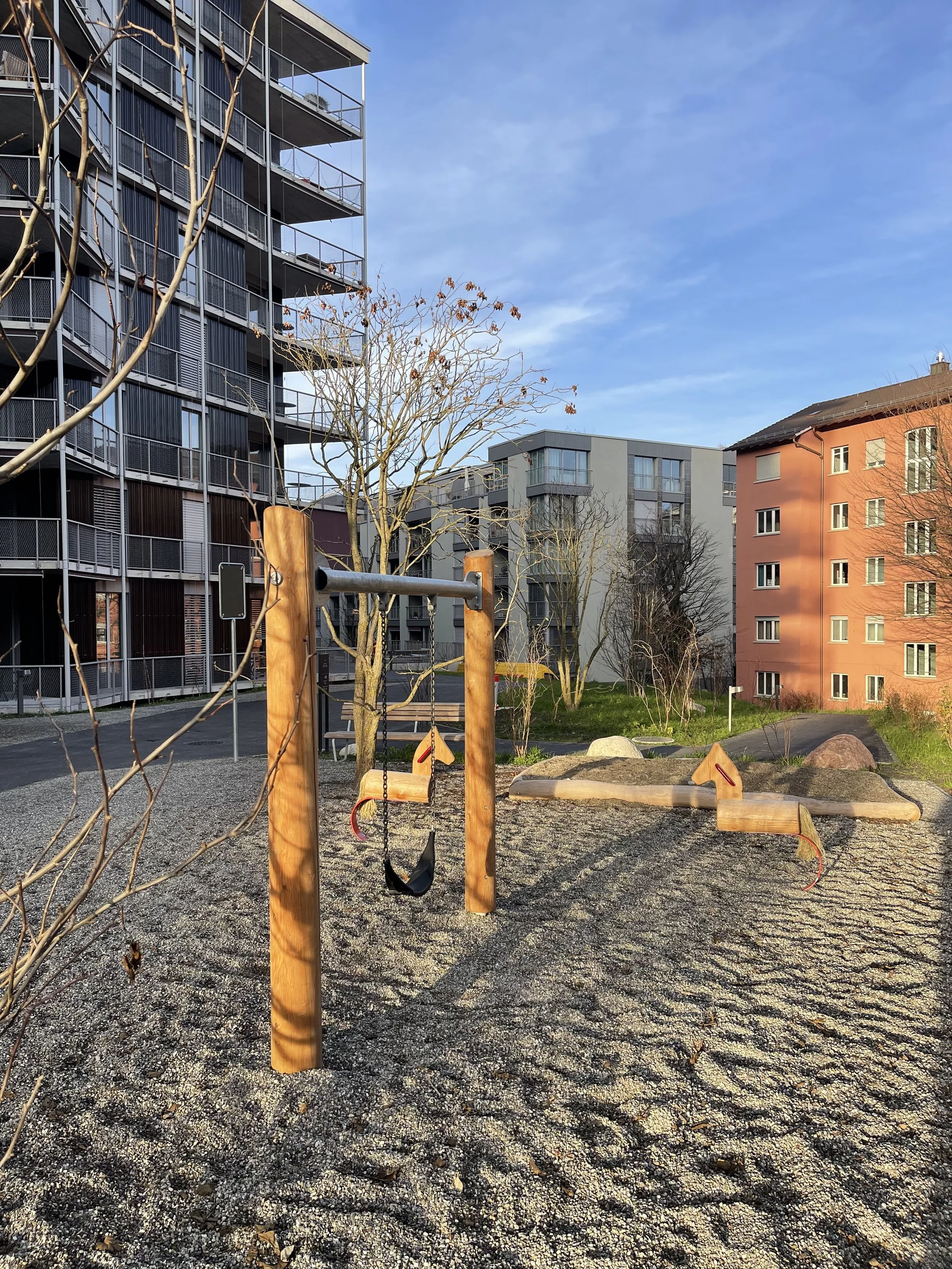 Ein besonderer Pluspunkt: Auf der Rückseite der Kita lädt ein eigener Aussenbereich zum Spielen ein. Und auch die Überbauung bietet einiges – mit mehreren Spielplätzen für kleine und grössere Kinder.